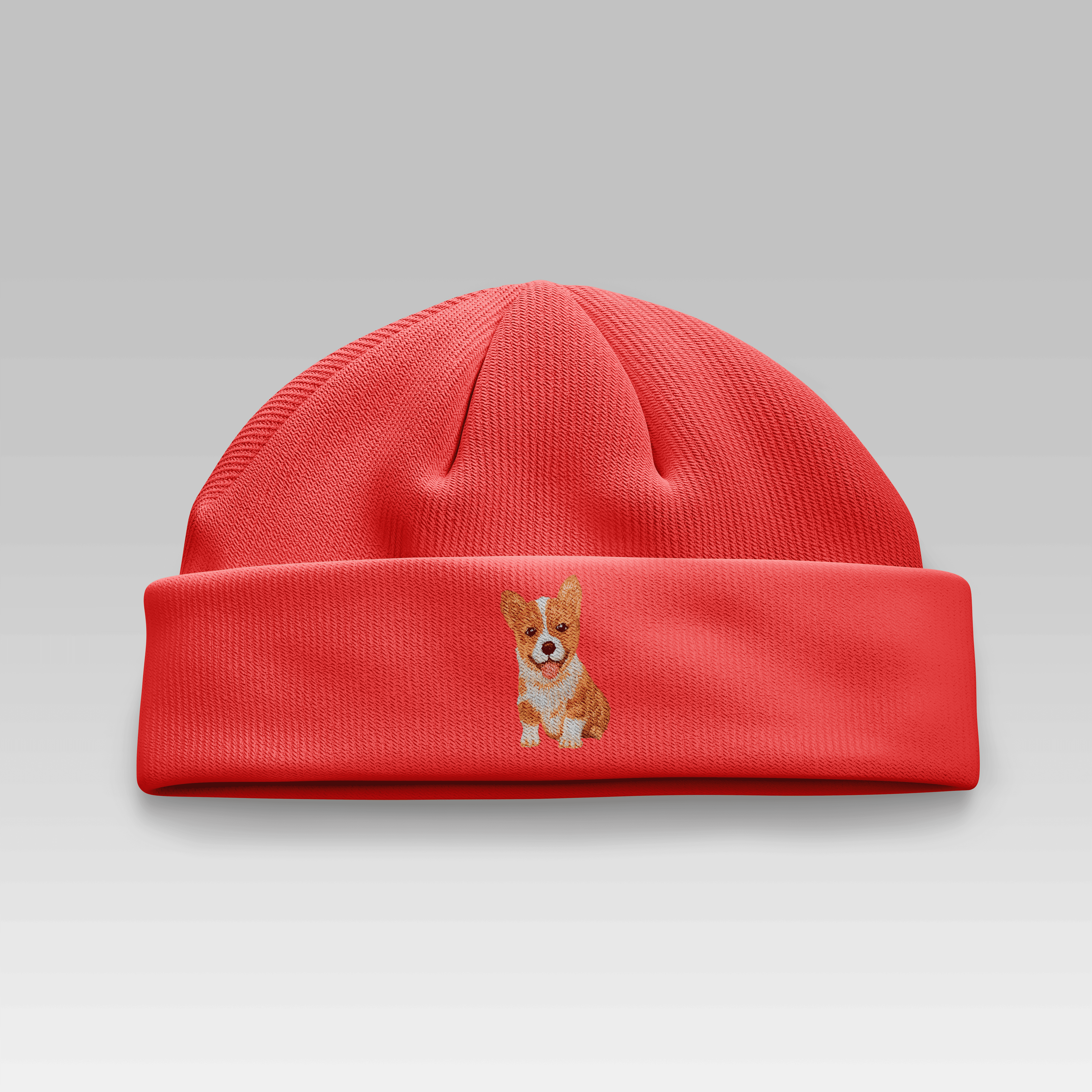 Bonnet rouge court en maille fait de coton avec petite personnalisation centrale sur le plie